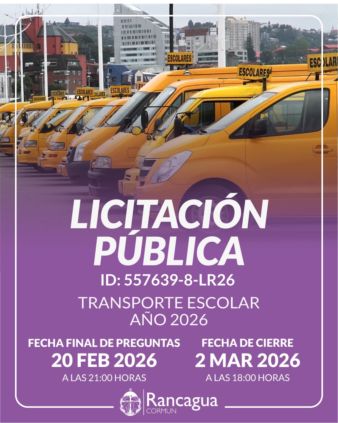 Se informa la apertura de una licitación pública en la ciudad de Rancagua, dirigida a empresas y proveedores interesados en participar en el proceso. Para conocer los detalles, bases administrativas y requisitos de postulación, los interesados deben ingresar al portal oficial de compras públicas www.mercadopublico.cl