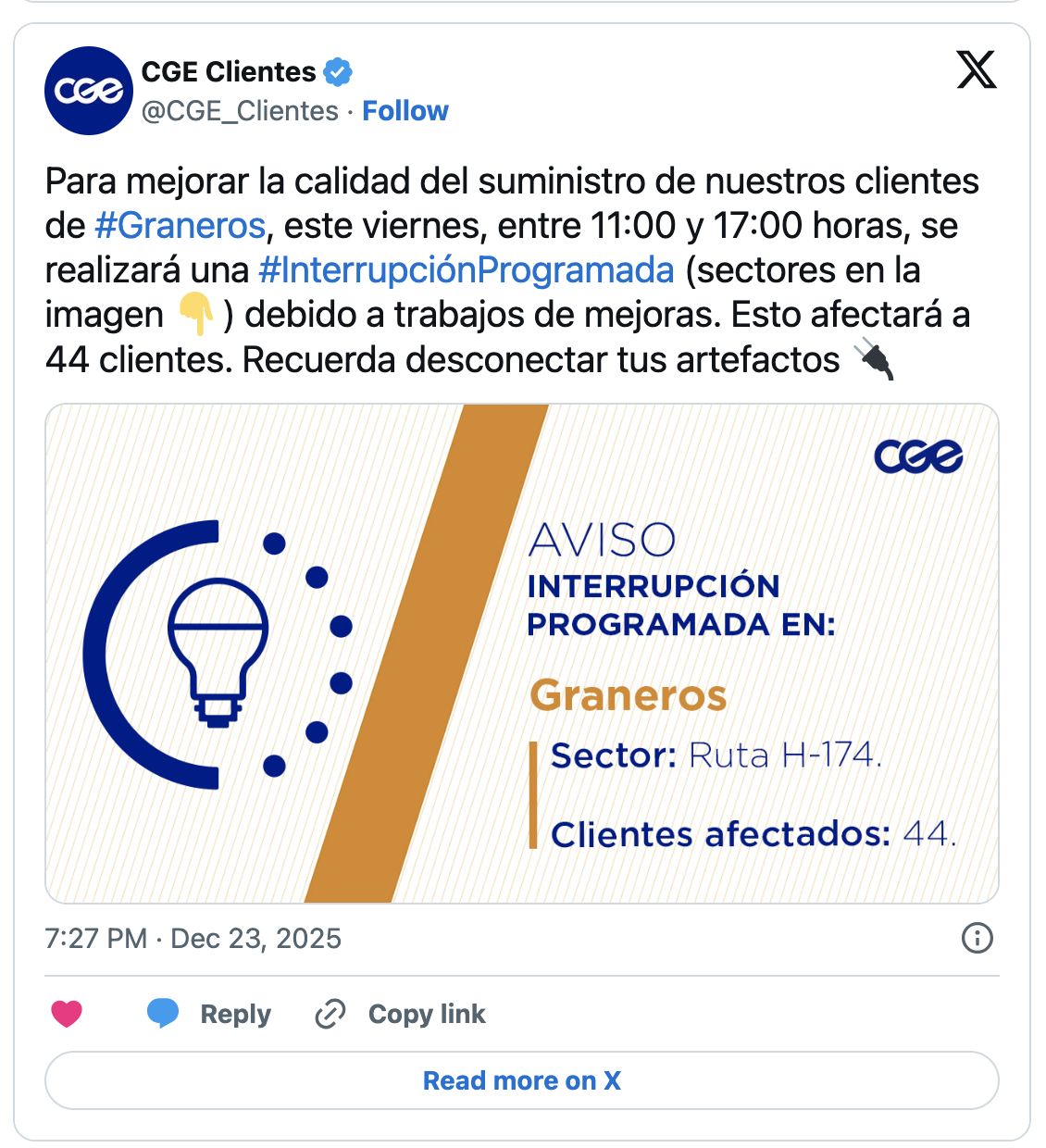 La empresa distribuidora de electricidad CGE informó una serie de cortes programados de suministro eléctrico que se registrarán este viernes 26 de diciembre en distintas comunas de la Región de O’Higgins, los que se suman a otras interrupciones comunicadas previamente en la zona.
